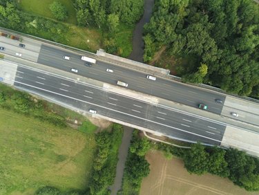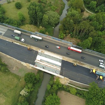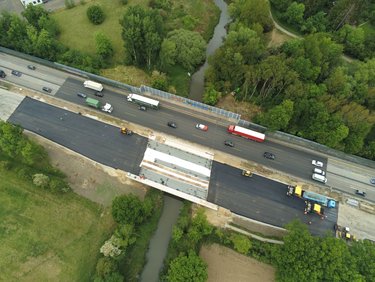 2 getrennte Überbauten für Richtungsfahrbahnen Überbau: Spannbeton (1-Feldsystem) Stützweite: ca 30,14 m Breite: 22,55 m (je Überbau) Flachgründung, Kastenwiderlager